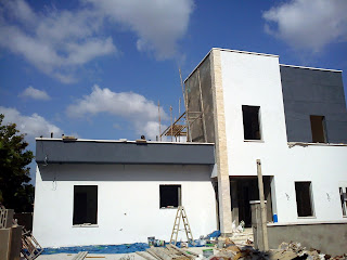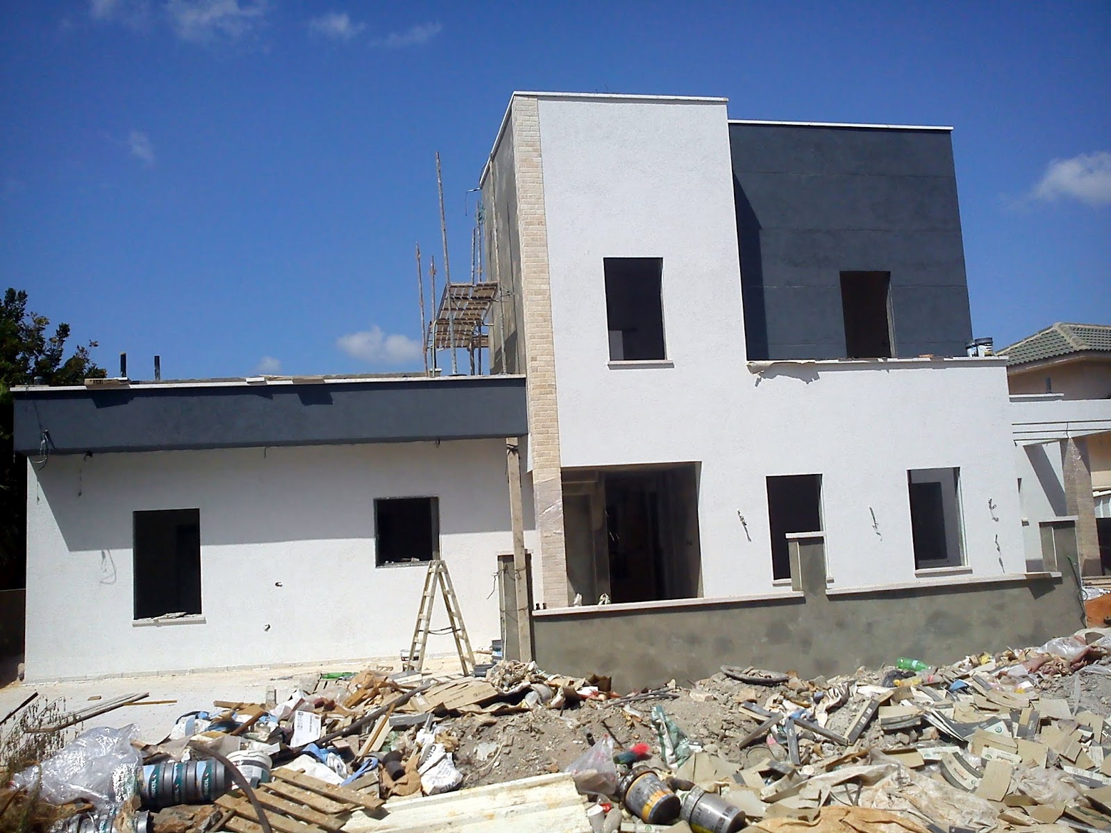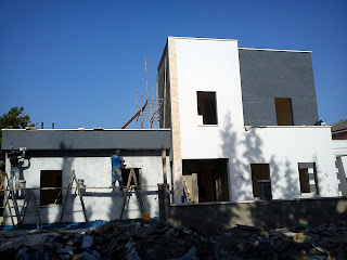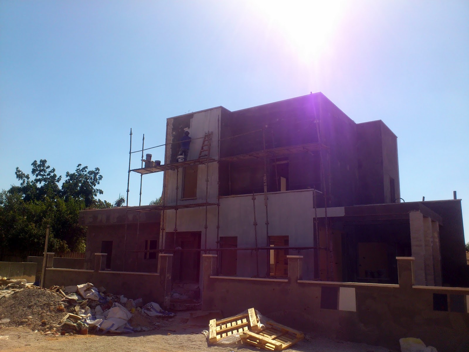 הפועלים מגיעים כמובטח ביום ראשון להרכיב את הפיגומים בחלק האחורי של הבית