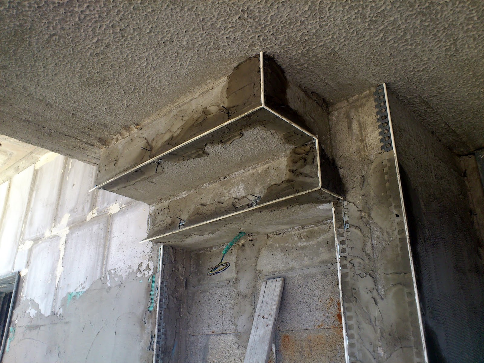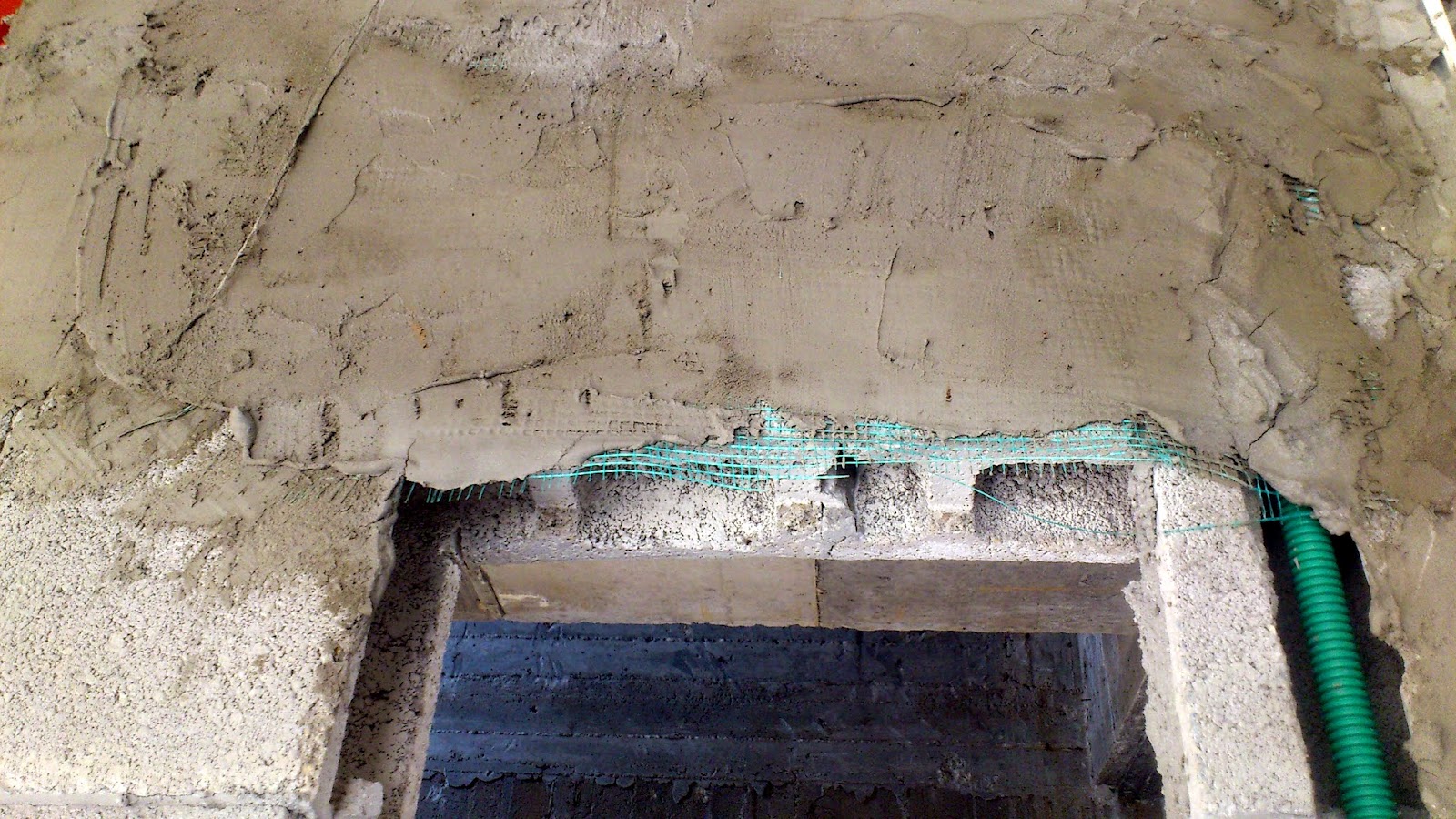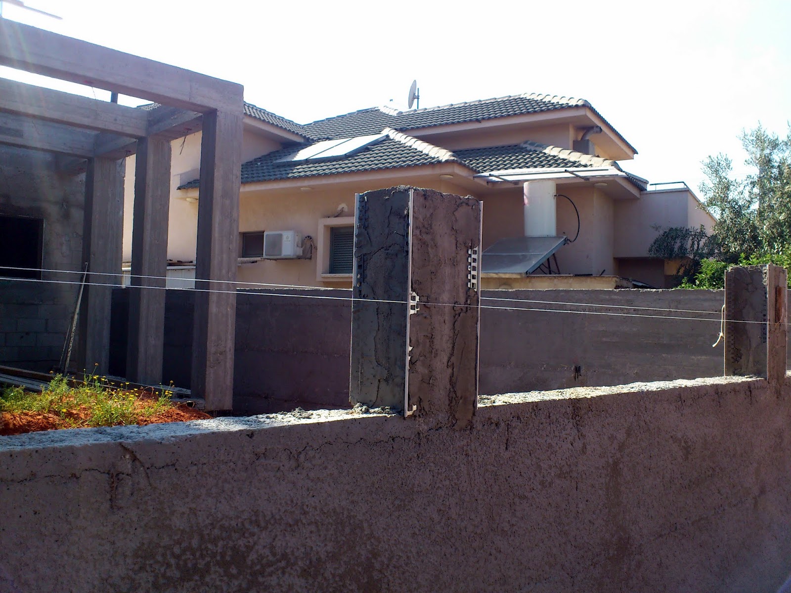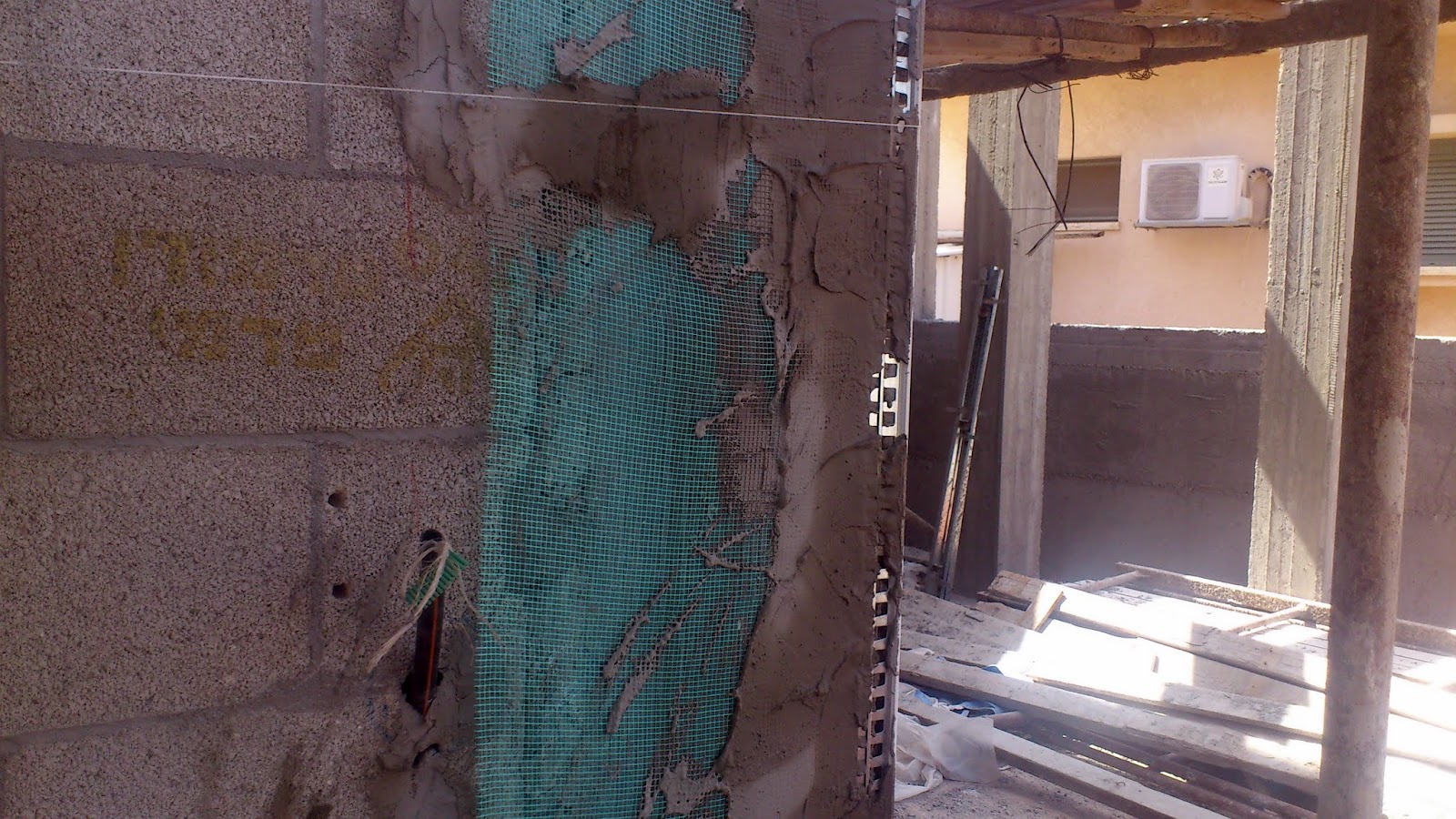 בתמונה הזו ובתמונות הבאות תראו הצמדה של רשת אינטרגלס היכן שיש מפגש של בלוקים/בטון למניעת סדקים בבית כגול חגורות ועמודים.
