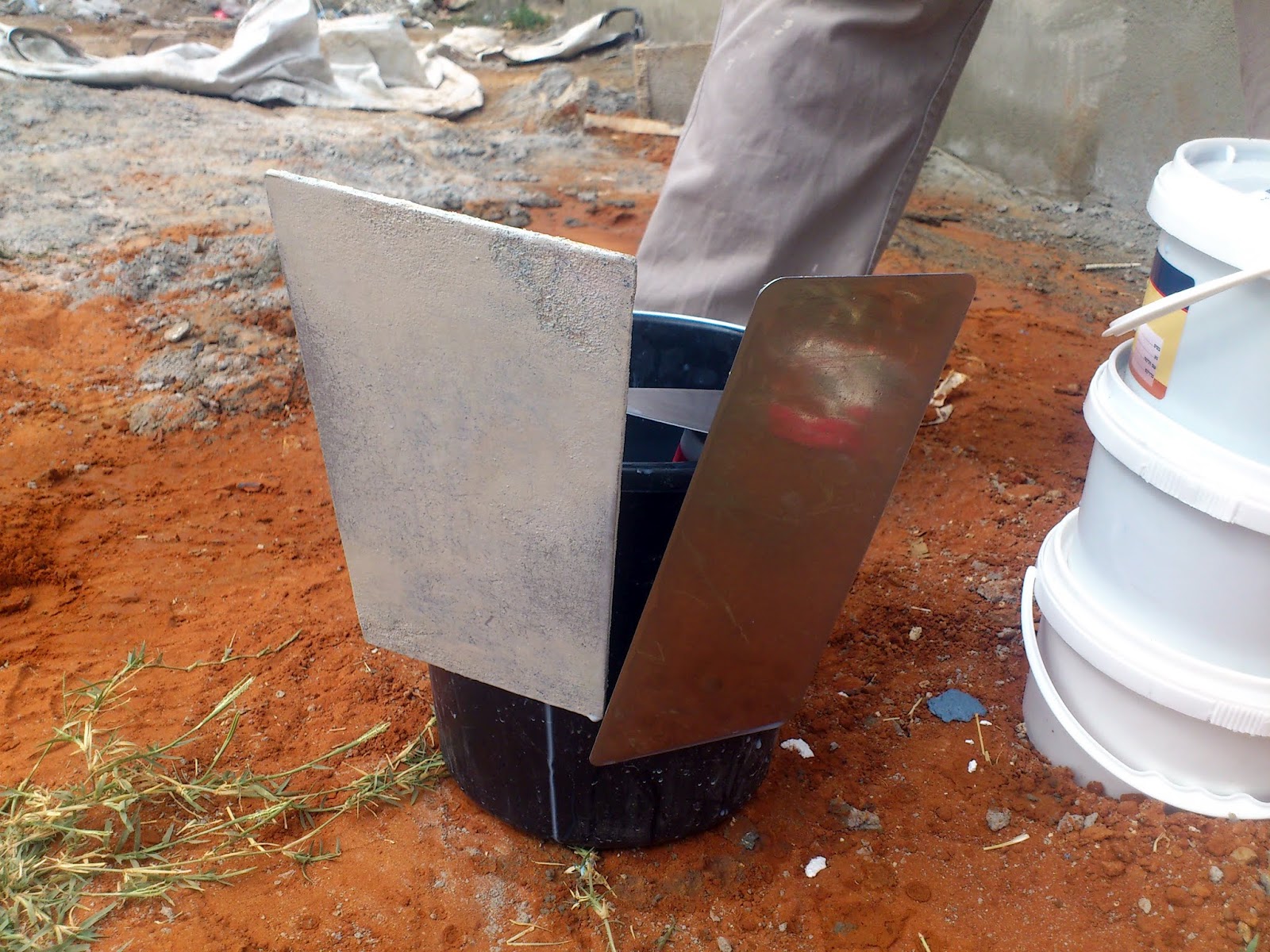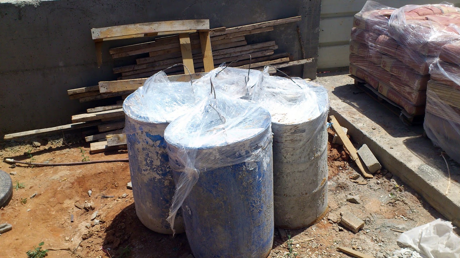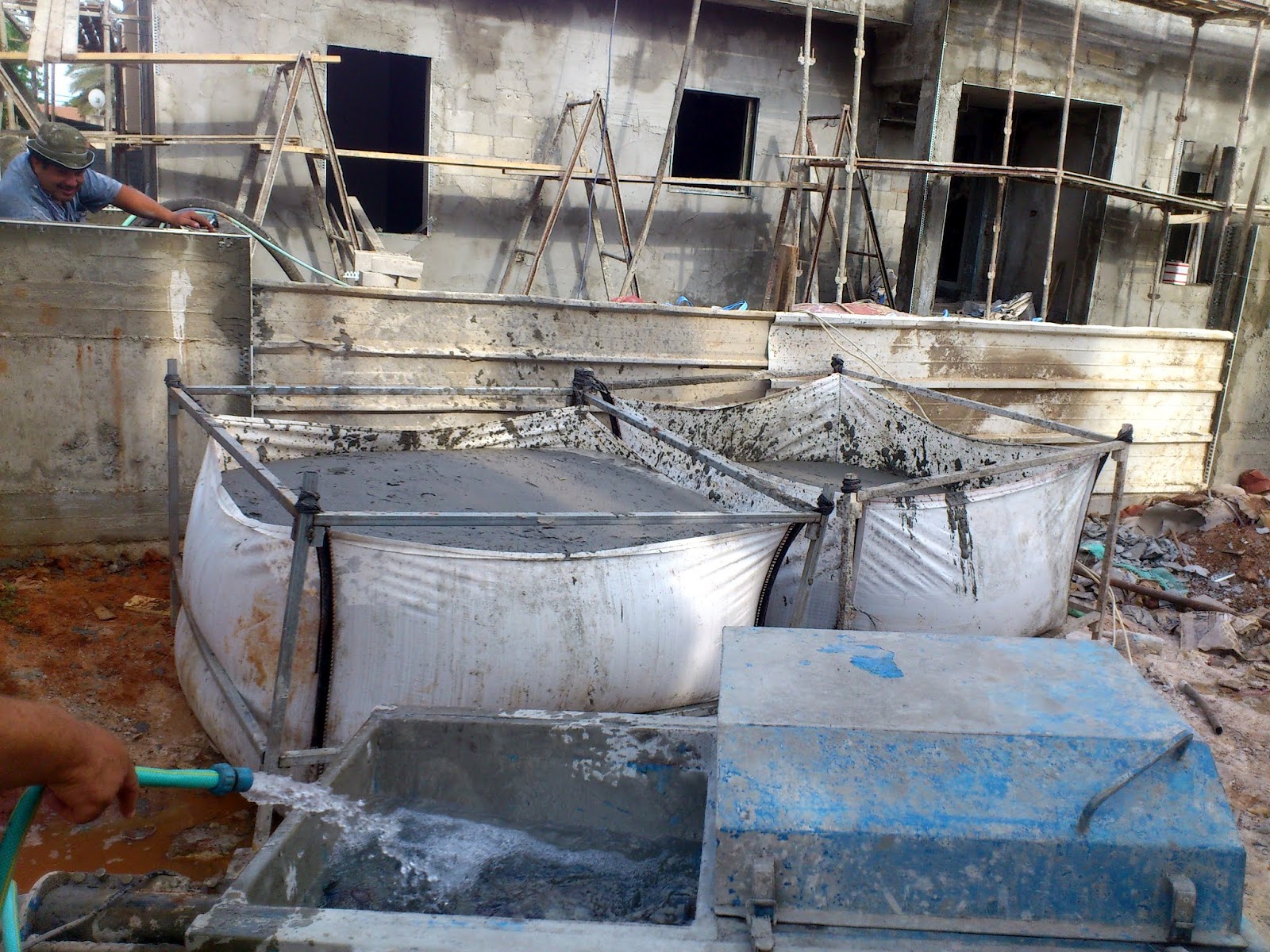 שופכים את שכבת ההרבצה לתוך הכלי הזה שמיכל כ 2 קוב.