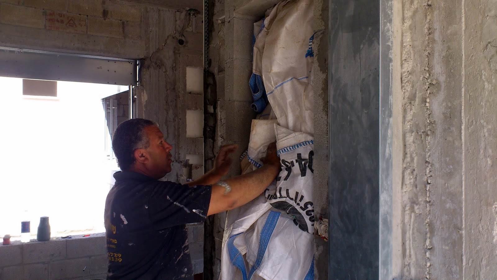 הטייח בודק פילוס משקופים עיוורים לקראת התקנת הפינות , פינות חייבות להיות מפולסות בפני עצמם בפרט וביחס לשאר פינות הבית הכלל.
