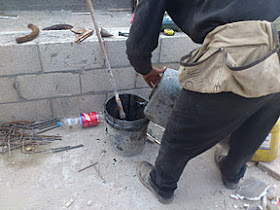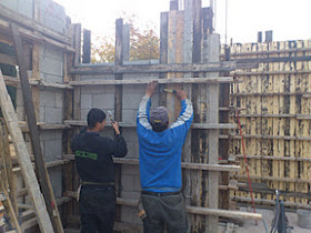 לאחר שביצעו טפסנות חגורות מעל החלון יצקו את הבטון אל תוך החגורות
