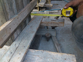 תוךים את הביון בקצה העליון של טפסנות העמודים ומודדים מרחק , מדידת המרחק מתבצעת גם בחלק התחתון ובמידה ואין התאמה מזיזים את טפסנות העמוד עד למציאת התאמה מדוייקת ומחזקים לקראת היציקה.